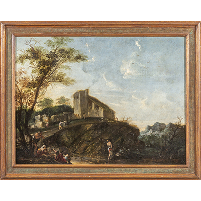 Scuola italiana sec.XVIII 'Paesaggio con casolare e personaggi' olio cm. 100x77